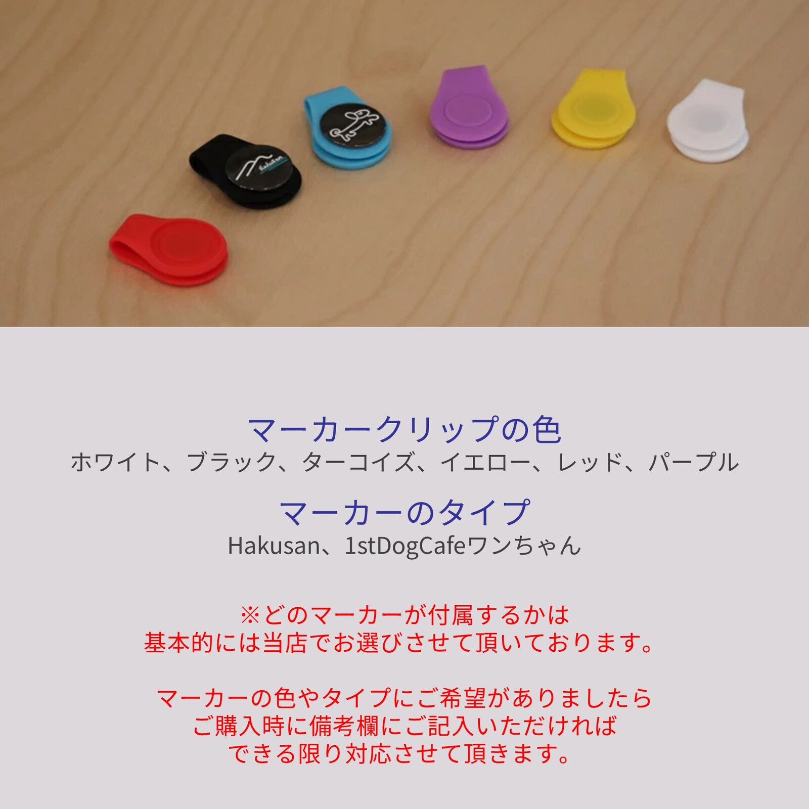 Hakusanオリジナルのゴルフマーカーセット(クリップ&マーカーのセット)が1セット付属します。マーカーセットのデザインはおまかせとなりますが、ご希望がございましたらご購入時に備考欄へご記入下さい。できる限り対応させていただきます。